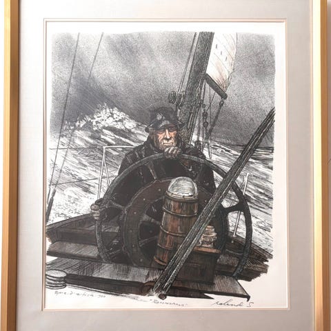 ROLAND SVENSSON. "Fyrmastfullriggare peijlar Tristan Da Cunha i Sydatlanten", färglitografi, signerad samt numrerad, 428/450/1