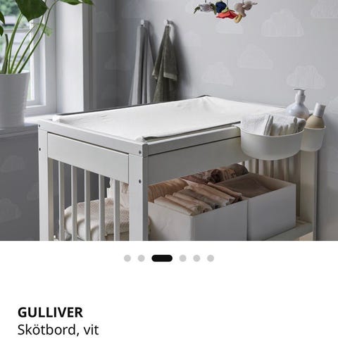 Säljer ett IKEA Gulliver skötbord med Vädra skötbädd och överdrag som endast är monterat. Det har stått som extra på landet men aldrig kommit till användning. Överdraget till skötbädden har fått någon liten fläck på sig men har inte tvättats.