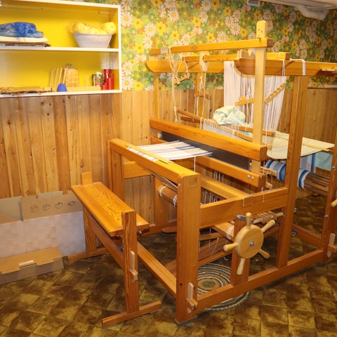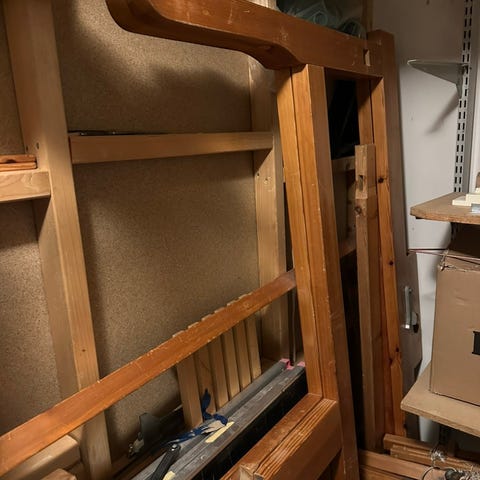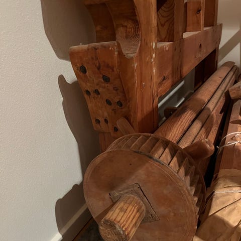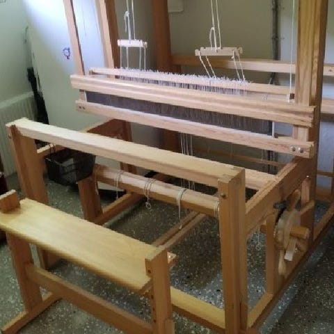 Vävstol i trä, använd för vävning av textilier från Glimåkra. Är i uppmärkta delar, ej monterad. 1000 kr. Liten vävstol med tillbehör okänt märke. 250 kr.