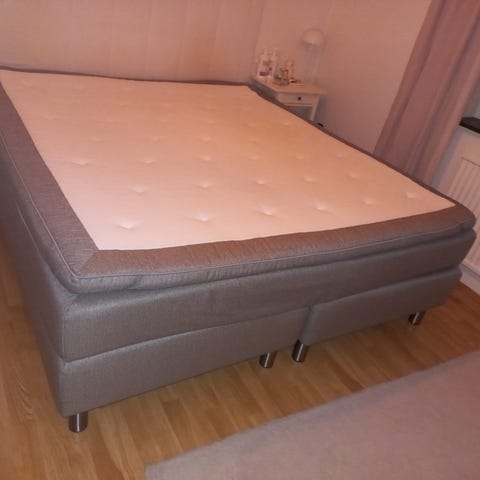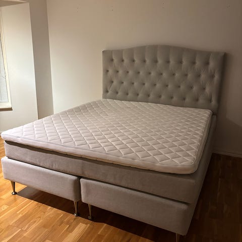 Kontinentalsäng från Mio I modellen New York med gavel. Tyget heter Royal ljusbeige. Sängen är inköpt vintern 2022 men är I toppenskick. Inga fläckar finns på madrasserna och sängen är väl omhändertagen och rengjord regelbundet. Djur- och rökfritt hem. Säljs pga flytt. Inköpt för 17999kr.