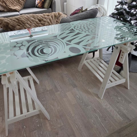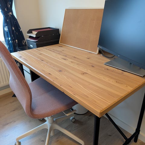 Kan används tex med en bordsskiva som skrivbord. Justerbar höjd och kan vinklas.