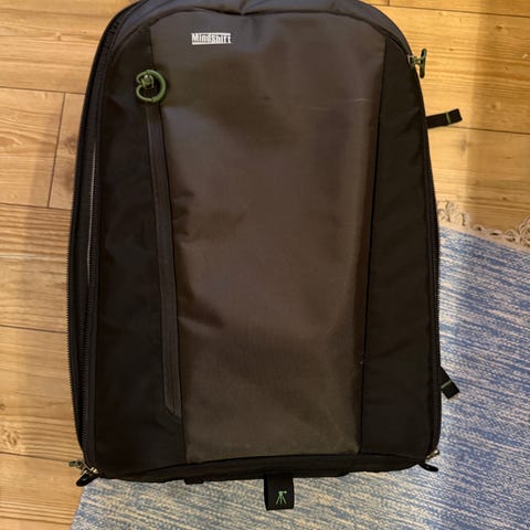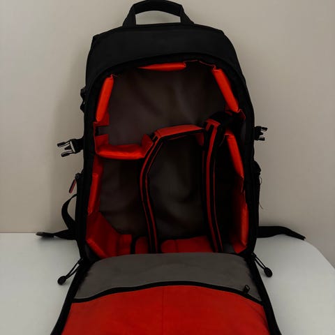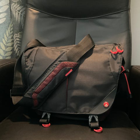 Manfrotto kameraryggsäck i svart tyg. Väskan har vadderade axelremmar och bärhandtag samt flera ytterfack med dragkedja för tillbehör. Invändigt finns utrymme för kamera och utrustning, med möjlighet till organisering av innehållet. Passar för transport och förvaring av kamerautrustning och tillbehör vid resor eller fotografering på plats.