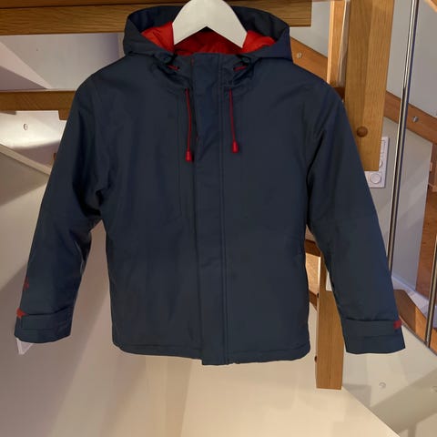 Jack Wolfskin jacka för barn i storlek 92, unisexmodell. Jackan är blå med mörkare partier upptill och har huva samt elastiska muddar vid ärmsluten. Insidan är fodrad med rött meshfoder. Jackan har dragkedja framtill och reflexdetalj bak. Passar som ytterjacka för barn i storlek 92.