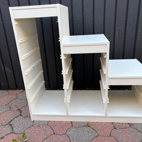 Bokhylla med flera horisontella hyllplan och tre nedre fack. Övre delen lämpar sig för böcker, leksaker eller dekorationer, medan de nedre facken kan användas för förvaring av större böcker, korgar eller annat material. Passar exempelvis i barnrum, vardagsrum eller hall för organiserad förvaring och översiktlig exponering av innehållet.