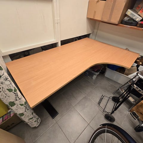 Hörnskrivbord med svart bordsskiva och vitt ställbart underrede. Bordsskivan har en vinklad form som ger extra arbetsyta och plats för exempelvis dator, skärm och tillbehör. Underredet är elektriskt höj- och sänkbart med kablar och styrpanel monterade under bordsskivan. Passar som arbetsbord eller skrivbord i hemmakontor eller kontorsmiljö. 160x110