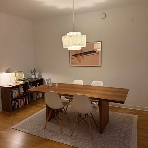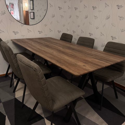 Rektangulärt matbord i trä med naturfärgad bordsskiva. Bordet har raka ben och en slät, träådrad yta. Passar som matbord i kök eller vardagsrum och ger plats för flera sittplatser runt bordet. This is incurring glasses for protection table