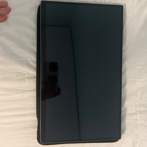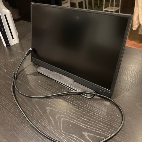 Asus bärbar bildskärm med 15,6-tums skärm. Skärmen är tunn och lätt och levereras med skyddsfodral/ställ samt kabel. Lämplig som extra skärm till laptop, stationär dator eller andra enheter som stödjer anslutning via medföljande kabel. Färg och exakt modellbeteckning framgår inte tydligt av underlaget.