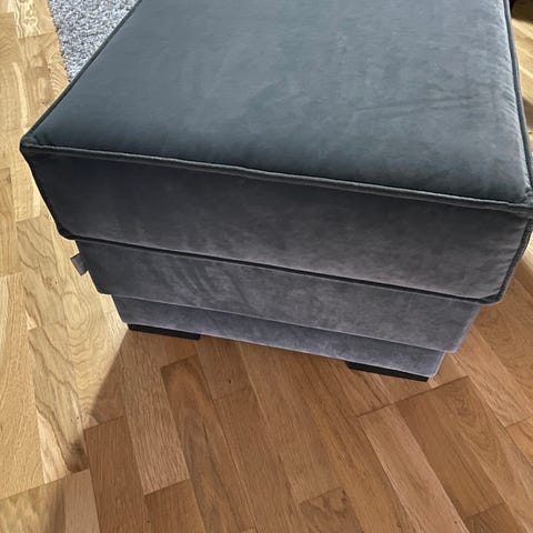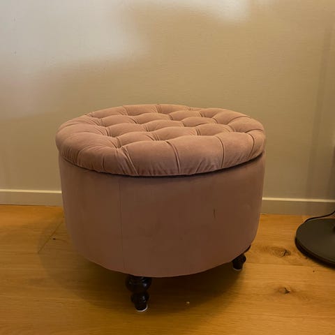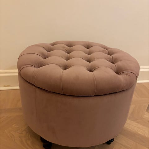 Rund pall i grön sammetsliknande klädsel med mässingsfärgad fot. Pallen har stoppad sits och fungerar som extra sittplats eller fotpall i vardagsrum eller sovrum. På sitsen finns ett synligt skav/risp som framgår av bilden.