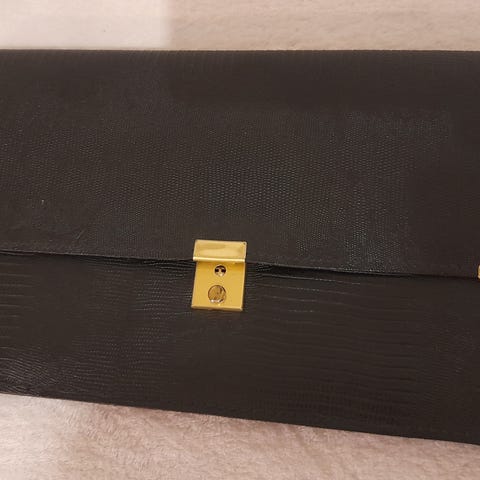 Den sexkantiga väskan i svart och guld fungerar bäst som prydnadsask också då handremmen är av (den finns kvar men går sannolikt inte att laga). I väskan finns en pudervippa. Orientalisk stil?