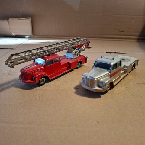 Volvo modell lastbil utformad som timmerbil med släp. Består av dragbil med timmerpåbyggnad och separat släpvagn med stolpar för last. Fleraxligt chassi på både bil och släp. Levereras med blå Volvo-förpackning märkt Volvo Truck Corporation. Lämplig som samlarobjekt eller prydnad. Volvo F26