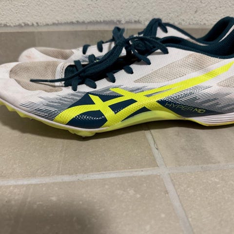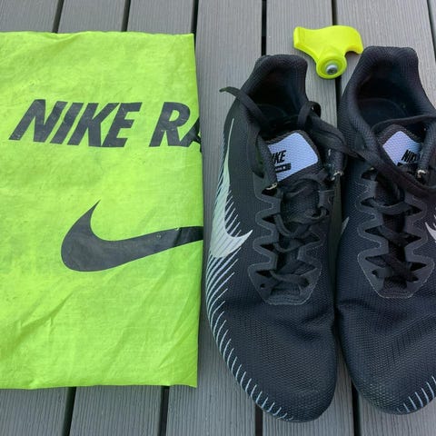 Vita, lätta Nike track and Field. Dottern har bara använt dem som extraskor vid enstaka sprintpass. Normalt slitage/smuts. Spikarna är okej, medkommer skruvare för eventuellt byte.