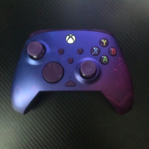 Trådlös handkontroll i blått kamouflagemönster med tillhörande USB-mottagare. Lämplig för användning vid olika typer av datorspel.