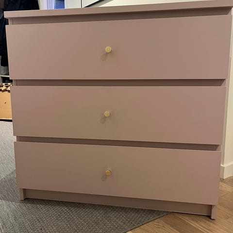 Byrå i trä. Vitmålad med knoppar o olika färger. 4 lådor. Bra skick men vissa spår efter användning i lådorna.
