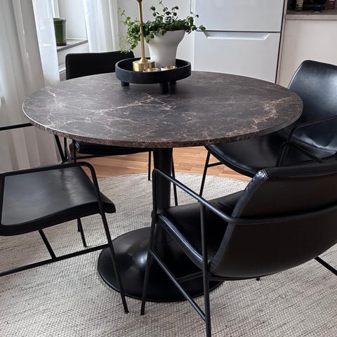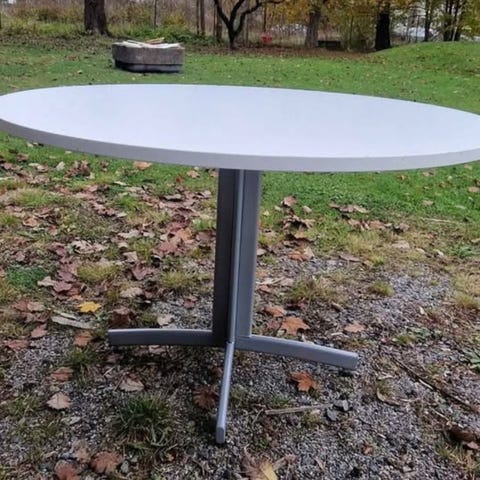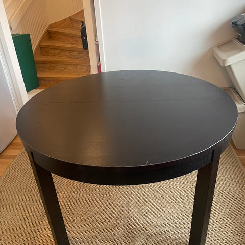 Bordsskivan har fått en övermålning där penseldragen syns. Trots det kan man använda det som det är eller slipa och måla om.
