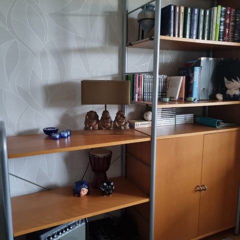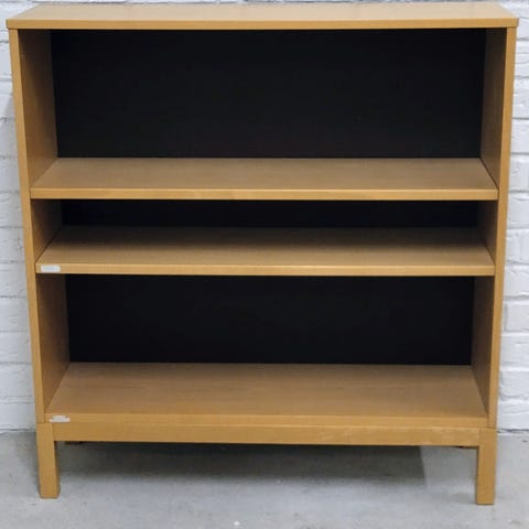Bokhylla i trä med flera fasta hyllplan i ljusbrun träfinish. Öppen framsida och sluten baksida. Passar för förvaring av böcker, pärmar eller prydnader i exempelvis vardagsrum, arbetsrum eller hall. Enkel, rak design med synlig träådring på sidorna. Ändast egen hämtning.