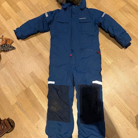 Varm och vattentålig vinteroverall från Polarn o Pyret. Vissa skavanker, ett kardborre saknas i knäppningen (se bild) och fothyskorna bör väl bytas om de ska användas. Dock inga hål eller sådant. Håller värmen bra. Omtyckt av vuxen och barn.