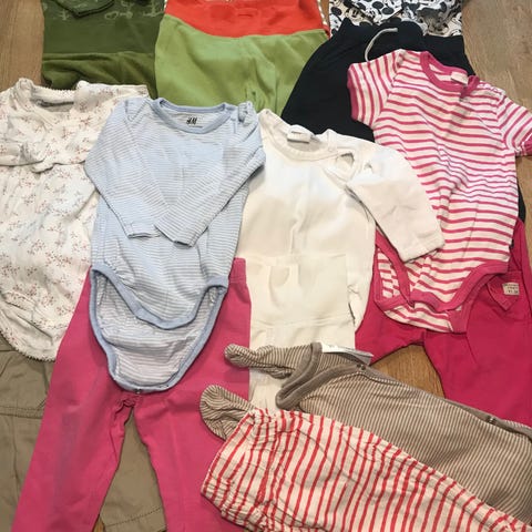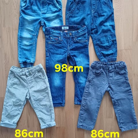 Klädpaket med byxor av olika slag, alla i storlek 86. Byxorna är i använt skick.