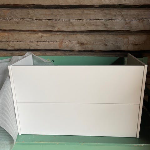 Vit ,insidan öppet utrymme med hål för eventuell rördragning. Underdel med utdragbar låda för förvaring av badrumsartiklar. Passar för montering i badrum där kommod med spegel och integrerad förvaring önskas.