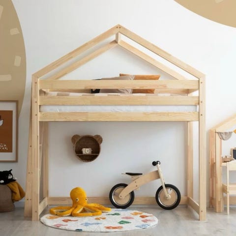 Hoppekids loftsäng i vit färg. Sängen har rak stege på kortsidan och skyddande sarger runt liggytan. Under sängen finns ett öppet utrymme som kan användas för förvaring eller lek. Passar som barnsäng i barnrum där man vill utnyttja golvytan under sängen. Jätte fin loft säng, 90*200.