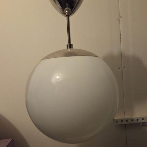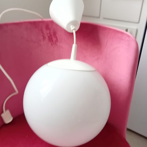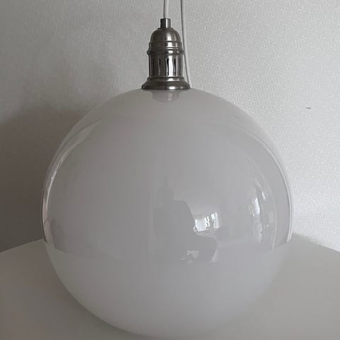 Säljer en pendellampa från Belid, modell T1264, med vit opalglaskupa och kromad upphängning.