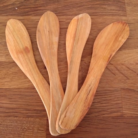 Smörknivar handgjorda, kan variera i storlek och form. Längd 170-180 mm. Oljade med rapsolja. Tål ej maskindisk. Finns i ek,bok, furu, teak,mahogny, körsbär.
