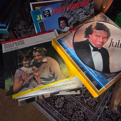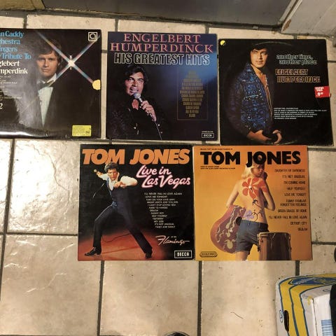 Samling LP-skivor med blandade artister och album. På bilderna syns bland annat skivor med Tom Jones, Agnetha Fältskog och flera andra artister. Antecknad lista över låtar och artister ingår som översikt över innehållet. Passar för den som vill utöka sin vinylsamling med olika artister och genrer.
