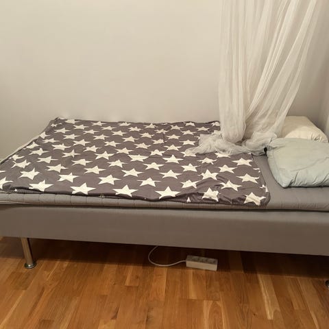 Mörkgrå säng kappa, bäddmadrass och madrasskydd finns om man vill ha.