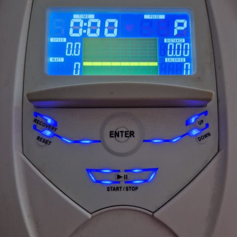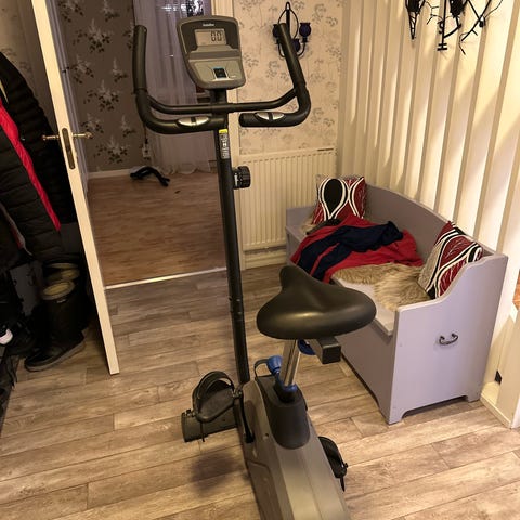 Energetics Magnetic motionscykel med träningsdator bla 12st förinställda program, pulsmätning, hastighet, distans, kaloriräknare m.m. Cykeln har ett magnetiskt motståndssystem och ett justerbart säte upp/ner samt även frampt/bakåt.. Styret är utformat för upprätt sittställning men går att ställa in på olika lägen. Batteriluckan saknas men går att sätta batterier och exempelvis ha tejp så de hålls på plats. Motionscykeln fungerar felfritt även utan dem, de är enbart för belysning på panelen.Pedalerna har remmar för bättre fotfäste. Lämplig för inomhusträning och konditionsträning i hemmet. Använd max 10ggr.