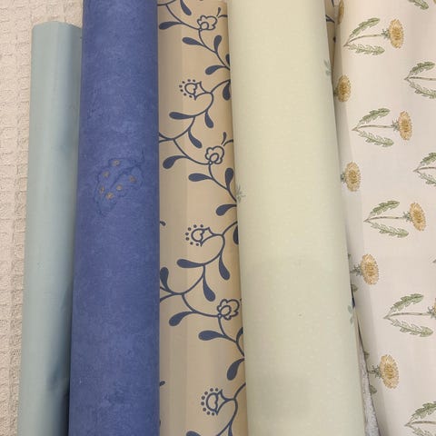 5 bitar äkta tapet med bl.a. olika cerisa klockor, fågelburar, New York porslin ( OBS! Ej printade papper utan äkta tapet för bästa färgäkthet) Passar bra till många olika hobby-projekt, tex miniatyrer, scrapping.
