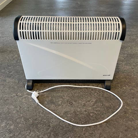 Konvektorelement i vit färg med fristående ben. Utrustad med två effektlägen, 1200W och 2000W, samt vred för temperaturreglering. Passar för uppvärmning av inomhusutrymmen där extra värme behövs. Ansluts med vanlig elkabel och stickkontakt.