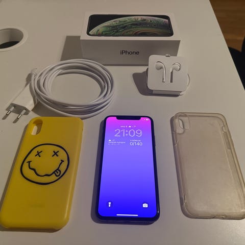 Apple iPhone XS mobiltelefon med 64 GB lagringsutrymme. Färgen är guld. Enheten använder Face ID för upplåsning. Lämplig för appar, surf, samtal och medielagring inom det angivna lagringsutrymmet.