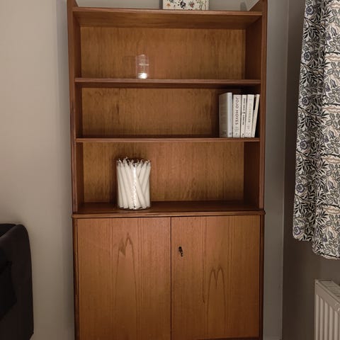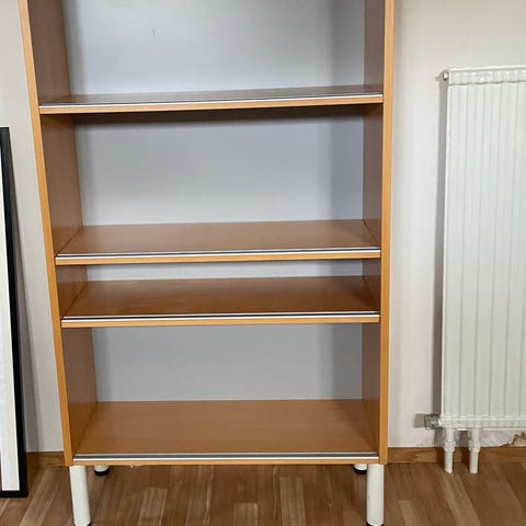 Bokhylla i bra skick. 3 delar, 2 som är 61 cm breda och mittendelen 101 cm. Inkl belysning