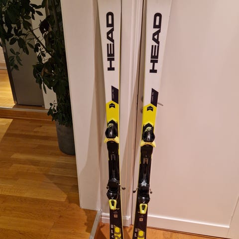 Head Free Team alpinskidor med bindningar i röd och blå färg. Skidorna har markerad modelltext "Free Team" framtill. Till skidorna hör ett par svarta och vita Head-pjäxor med justerbart spänne samt ett par stavar med flerfärgat mönster.. Skidor, pjäxor och stavar säljs tillsammans som komplett alpint paket.