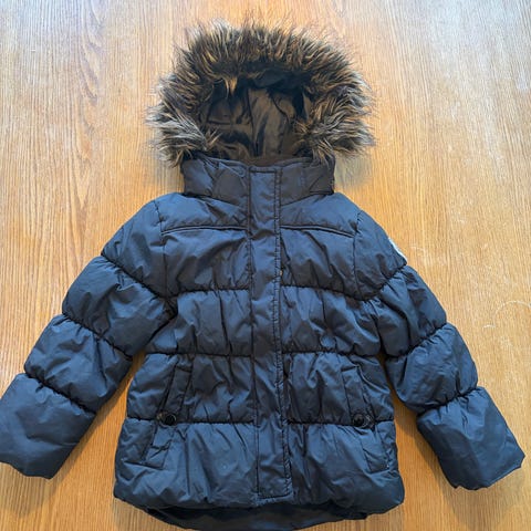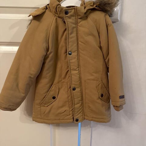H&M jacka för barn, storlek 110, avsedd för flicka. Jackan är brun och guld detaljer tillverkad i polyester. Modellen har huva med fuskpäls, dragkedja framtill samt fickor med knappar. Fodrad insida i quiltad polyester för extra värme. Passar som ytterjacka under kyligare väder.