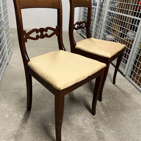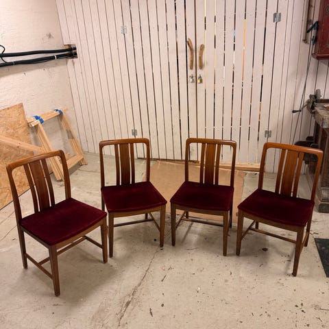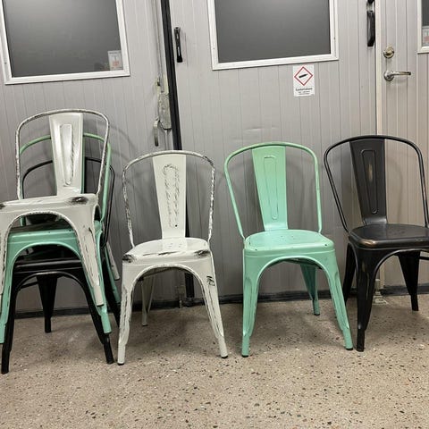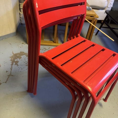 Säljer dessa unika röda metallstolar pga flytt. Staplingsbara.