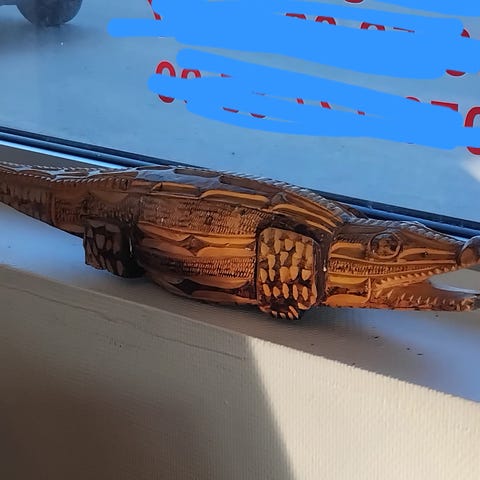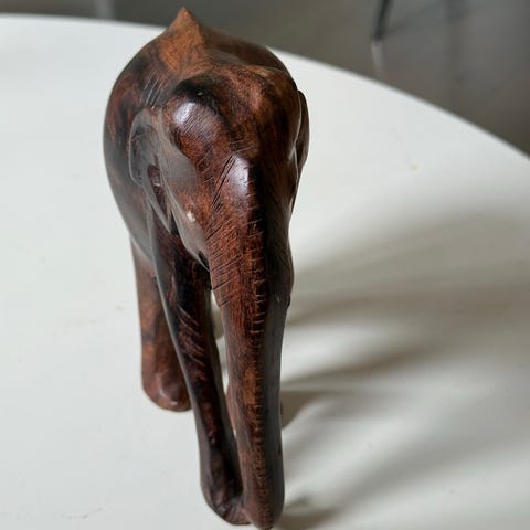 Träfigur föreställande en buffel i brun trä. Figuren är skulpterad med markerade ben, huvud och horn. Passar som dekoration i hemmet, exempelvis på hylla, bord eller fönsterbräda.
