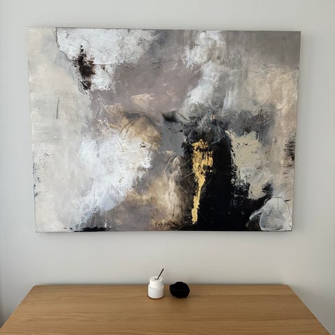 Abstrakt figurativ målning med tre stiliserade kroppar i vitt och mörkgrått mot gulbrun bakgrund. Verket är utfört på duk eller pannå och signerat i nedre kanten. Passar som väggkonst i vardagsrum, sovrum eller arbetsrum. Exakta mått, teknik och material kan anges av säljaren vid behov.