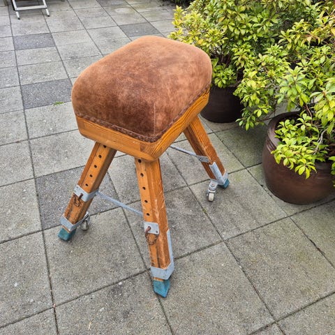 Gymnastikbock i trä med brun vadderad sits. Stabil konstruktion med fyra ben och metallförstärkningar, höj och sänkbar, mellan 130-200 cm. Sitsen är klädd i läder, rektangulär med rundade kanter. Passar för gymnastikövningar, träning eller kanske främst som inredningsdetalj i exempelvis hem, föreningslokal eller studio. Nya finns för 19500 kr, men då utan patina. Hämtas av köparen.