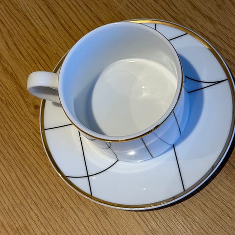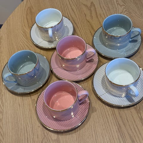 Ellos Eden Collection tekoppar med fat i blå keramik. Koppar och fat har handmålat fiskmotiv i blå, gröna och orange toner. Insidan är ljust cremefärgad. Undersidan är märkt med "Eden Collection Designed in Italy". Passar för servering av te, kaffe eller andra varma drycker vid dukning i kök eller matsal.Bly fritt