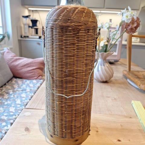 Picknickset i korg med rottingutseende och grönvitrutigt tygfoder. Insidan av locket har remmar som håller en grön plastservis med tallrikar, muggar, bestick och tillhörande textilservetter. Korgen fungerar som förvaring och transport av servisen vid picknick eller utflykter. Setet är avsett för användning i kök eller utomhusmiljöer där lätt och tålig servis önskas.