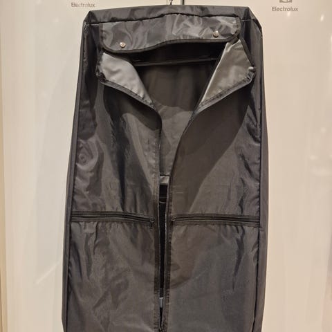 Klädpåse med dragkedja i grå färg. Påsen har genomskinliga partier framtill för överblick av innehållet och är avsedd för förvaring och skydd av kläder, till exempel kostymer, klänningar eller jackor i garderob eller vid transport.