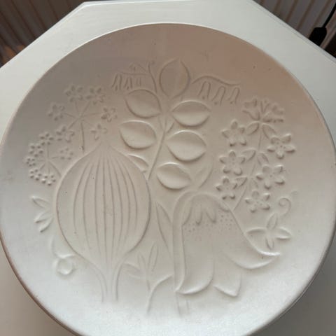Dekorativ glasform i klart pressat glas med klassiskt mönster och vågig kant. Passar bra som serveringsform, uppläggningsfat eller som dekorativ detalj på bord eller bänk.