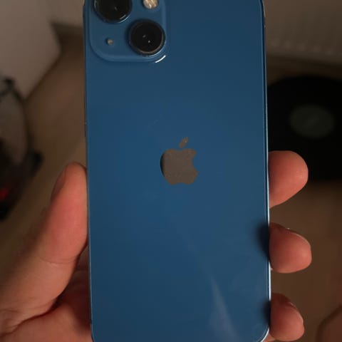 Apple iPhone 13 smartphone med 128 GB intern lagring. Modellen har dubbla bakre kameror, Face ID och en skärm med sensorpanel överst. Baksidan är blå med Apple-logotyp i mitten. Passar för vardaglig användning som samtal, meddelanden, surf, appar och fotografering.