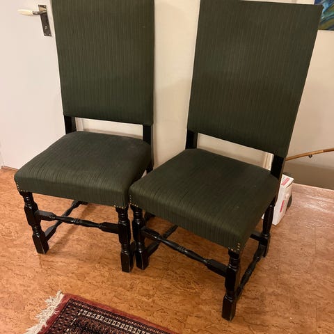Två stabila stolar i bra skick, men utan klädsel. Klädsel finns att köpa på flera ställen, även stretchiga som passar många mått. Bara att googla.