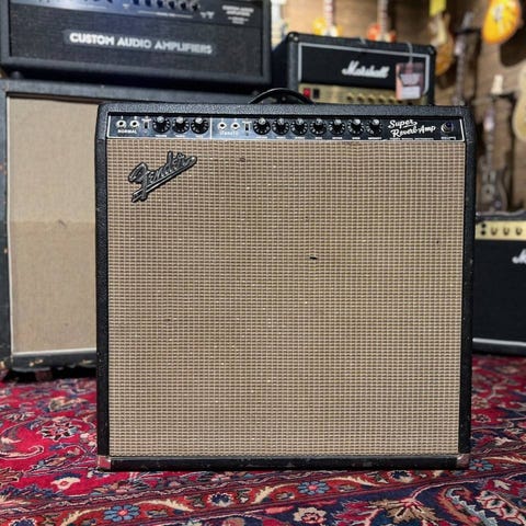 Kollar intresset för min Super Reverb från -68. Den är i ett otroligt fint skick, ser knappt använd ut, helt original. Det är övergångsmodellen från blackface till silverface då de fortfarande hade samma kretsar som blackface (AB763). Den så kallade "Drip edge" modellen med den snygga aluminumramen runt fronttyget.
