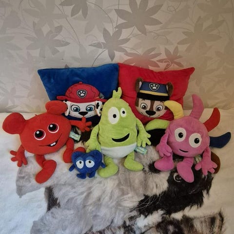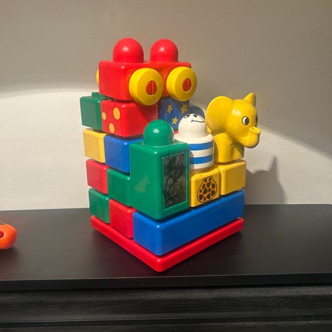 Babblarna klosslåda i träleksak med färgglada figurer på sidorna. Lådan har olika utskurna former där barnet kan stoppa i matchande klossar. Överdelen är grön med flera formade hål. Leksaken tränar barnets finmotorik, hand-öga-koordination och formigenkänning. Passar för mindre barn under uppsikt av vuxen.