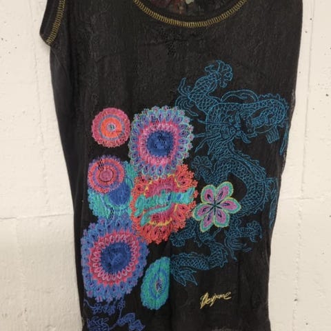 Desigual linne för dam i storlek M. Linnet är svart med mönstrade detaljer och tryck framtill. Tillverkat i ett mjukt material som passar för vardagsbruk eller sommarbruk. Ärmlös modell med rund halsringning.