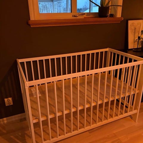 spjälsäng i vit färg. Klassisk modell med ribbor runtom och hel gavelsida. Passar standard spjälsängsmadrass. Lämplig för spädbarn och småbarn som behöver sova i tryggt avgränsad säng. Sängen är fristående och placeras direkt på golvet i barnrummet eller sovrummet.