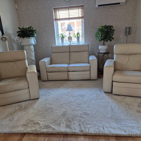 Sittkuddarna har ett visst slitage, särskilt den i mitten, men inte trasig alls.