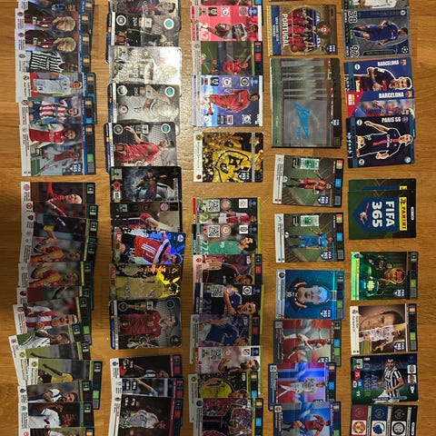 Panini fotbollssamlarkort i blandad samling. Flera olika lag och spelare, inklusive specialkort och bas kort. Kort i standardstorlek för samlarkort, med färgtryck på framsida och information på baksida.